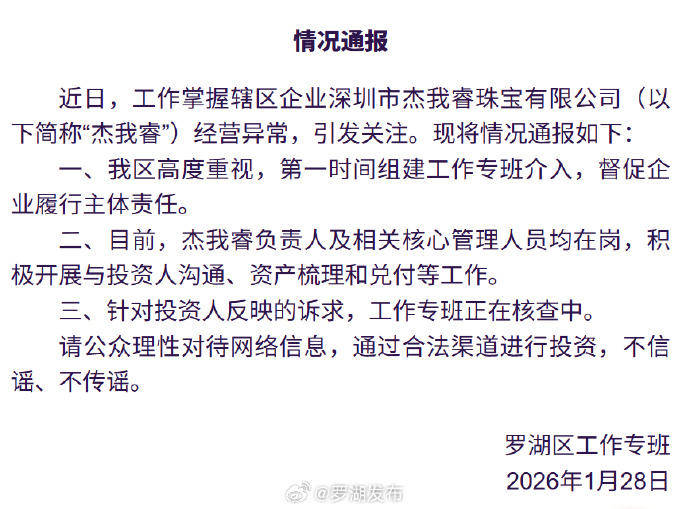 1月28日,针对水贝黄金预定价平台“杰我睿”出现兑付困难传闻,深圳市罗湖区工作专班发布情况通报: