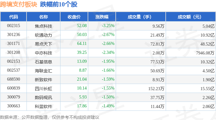 证券之星消息,1月28日跨境支付板块较上一交易日下跌1.02%,焦点科技领跌。当日上证指数报收于4151.24,上涨0.27%。深证成指报收于14342.9,上涨0.09%。跨境支付板块个股涨跌见下表: