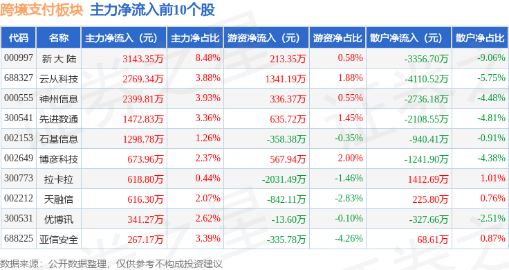 从资金流向上来看,当日跨境支付板块主力资金净流出9.58亿元,游资资金净流入3.67亿元,散户资金净流入5.91亿元。跨境支付板块个股资金流向见下表: