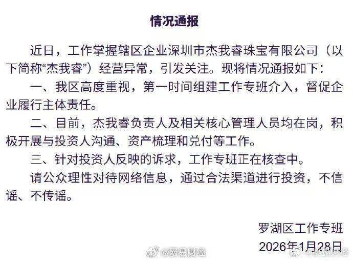 不过早在1月25日,深圳市杰我睿珠宝有限公司就发布公告称,截至2026年1月24日,公司已主动申请政府部门对全部资产进行监管,公司资产不存在被转移的可能。截至2026年1月24日,公司实际控制人及全部高管均积极开展工作,不存在外逃或逃避责任的可能。