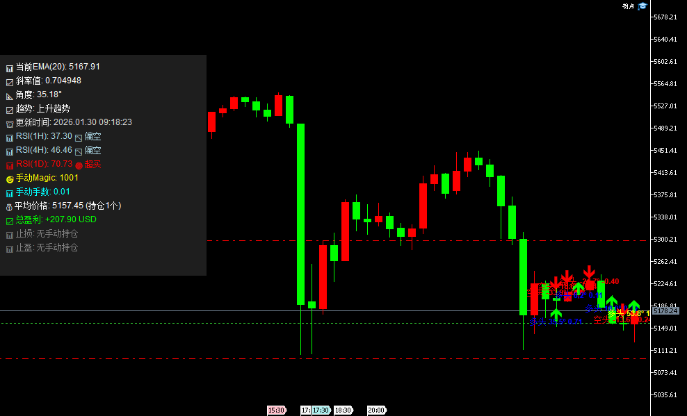 黄金市场正处于一个极其敏感和关键的节点。在经历了昨日(1月29日)接近500美元的史诗级巨震后,金价目前交投于 5100-5400美元/盎司 区域,从逼近5600美元的历史高位回落。