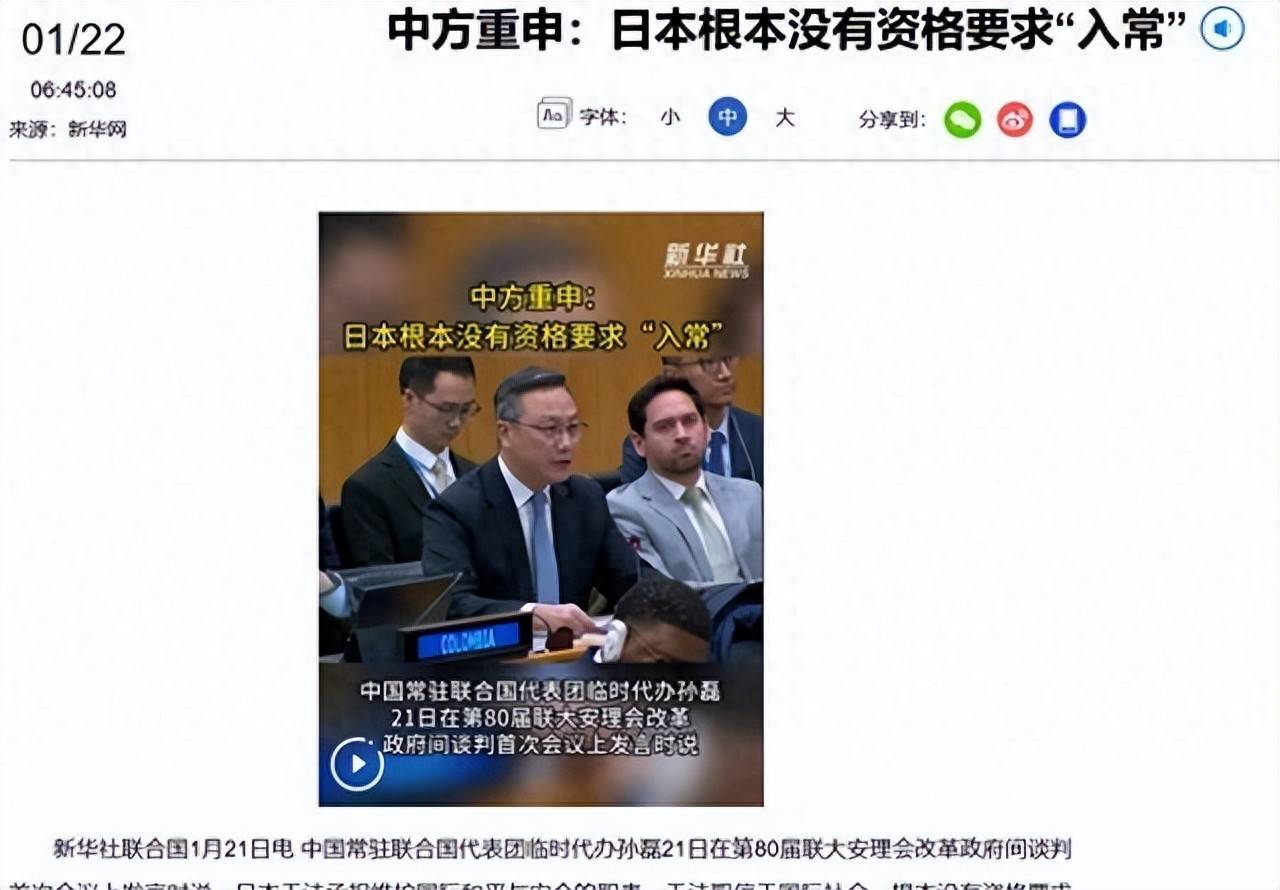 把目光聚焦到2026年1月的东京。近几天,日本政坛弥漫着一种压抑而扭曲的氛围,甚至有些接近歇斯底里的程度。这一切的起因,源自1月21日第80届联合国大会安理会改革政府间谈判的首次会议上。那一天,中国常驻联合国代表团临时代办孙磊,毫不遮掩地向全球代表们表达了中国的立场。他没有采用一贯的外交辞令,而是直言不讳地指出:日本并没有资格承担维护国际和平与安全的责任,不能赢得国际社会的信任,因此根本没有资格成为安理会常任理事国。话音刚落,这一声明就像一记重磅炸弹,瞬间炸裂了日本几十年来精心策划的大国梦。这一消息传回日本,舆论场的反应可谓是惊天动地。众多日本网民纷纷在社交平台上陷入愤怒,甚至有人提出极端的口号:既然联合国不给日本常任理事国的席位,那日本干脆退出联合国,连那昂贵的会费也不交了。