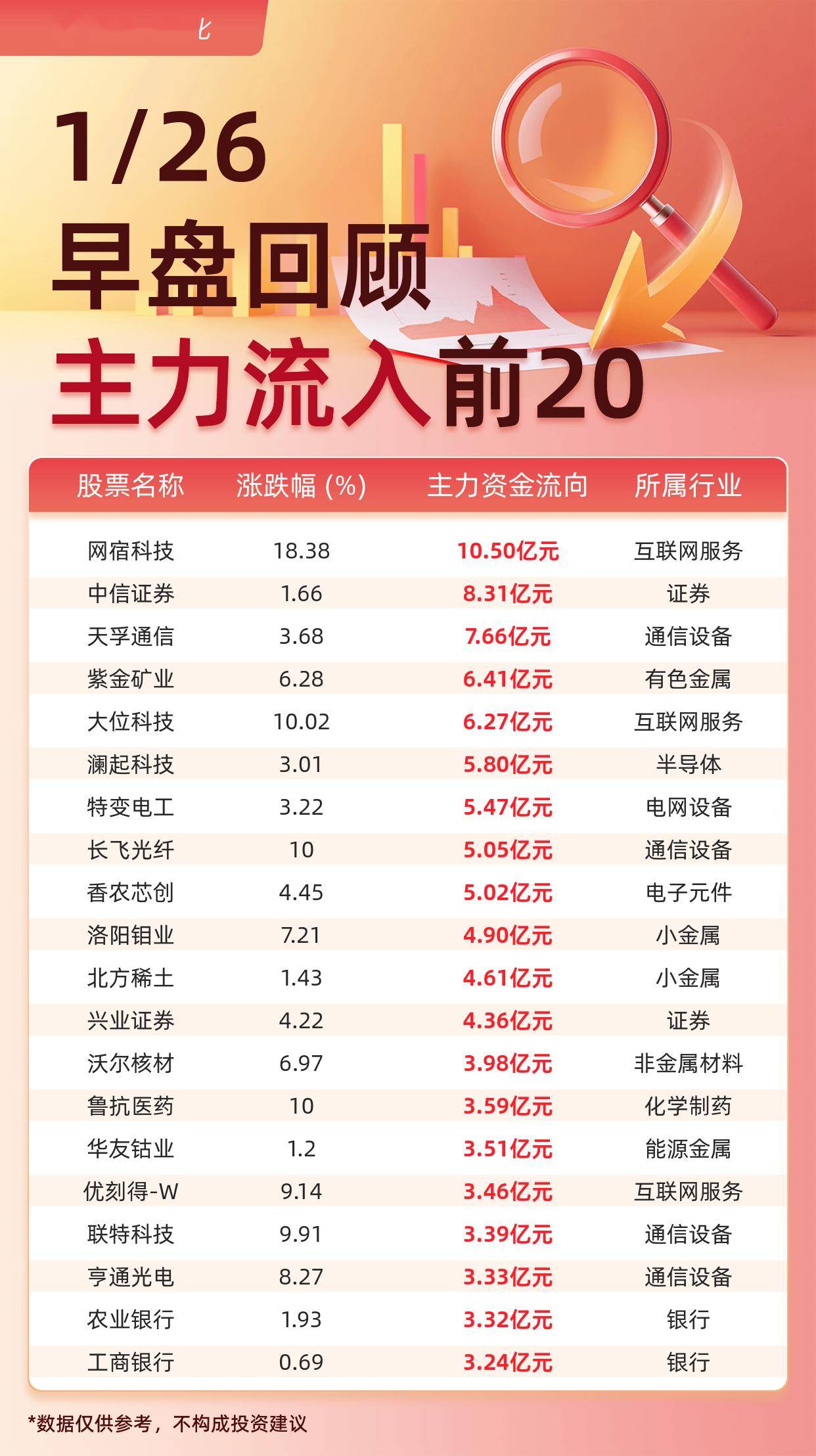 据交易所数据显示,截至1月26日午间收盘,主力资金流入前20的股票分别为: 网宿科技(10.50亿元)、 中信证券(8.31亿元)、 天孚通信(7.66亿元)、 紫金矿业(6.41亿元)、 大位科技(6.27亿元)、 澜起科技(5.80亿元)、 特变电工(5.47亿元)、 长飞光纤(5.05亿元)、 香农芯创(5.02亿元)、 洛阳钼业(4.90亿元)、 北方稀土(4.61亿元)、 兴业证券(4.36亿元)、 沃尔核材(3.98亿元)、 鲁抗医药(3.59亿元)、 华友钴业(3.51亿元)、 优刻得W(3.46亿元)、 联特科技(3.39亿元)、 亨通光电(3.33亿元)、 农业银行(3.32亿元)、 工商银行(3.24亿元)。