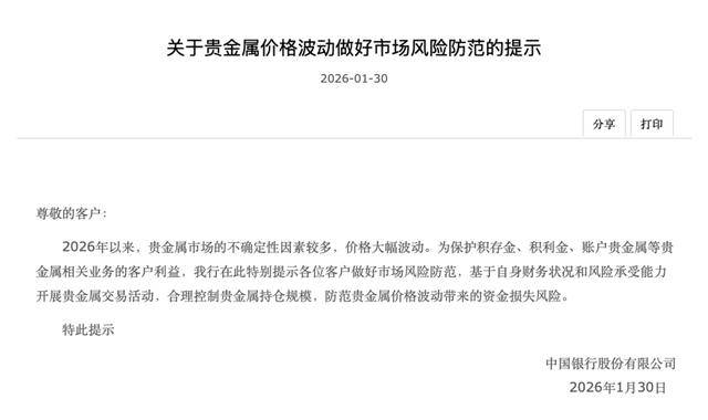 1月30日,中国银行表示,2026年以来,贵金属市场的不确定性因素较多,价格大幅波动。为保护积存金、积利金、账户贵金属等贵金属相关业务的客户利益,特别提示各位客户做好市场风险防范,基于自身财务状况和风险承受能力开展贵金属交易活动,合理控制贵金属持仓规模,防范贵金属价格波动带来的资金损失风险。