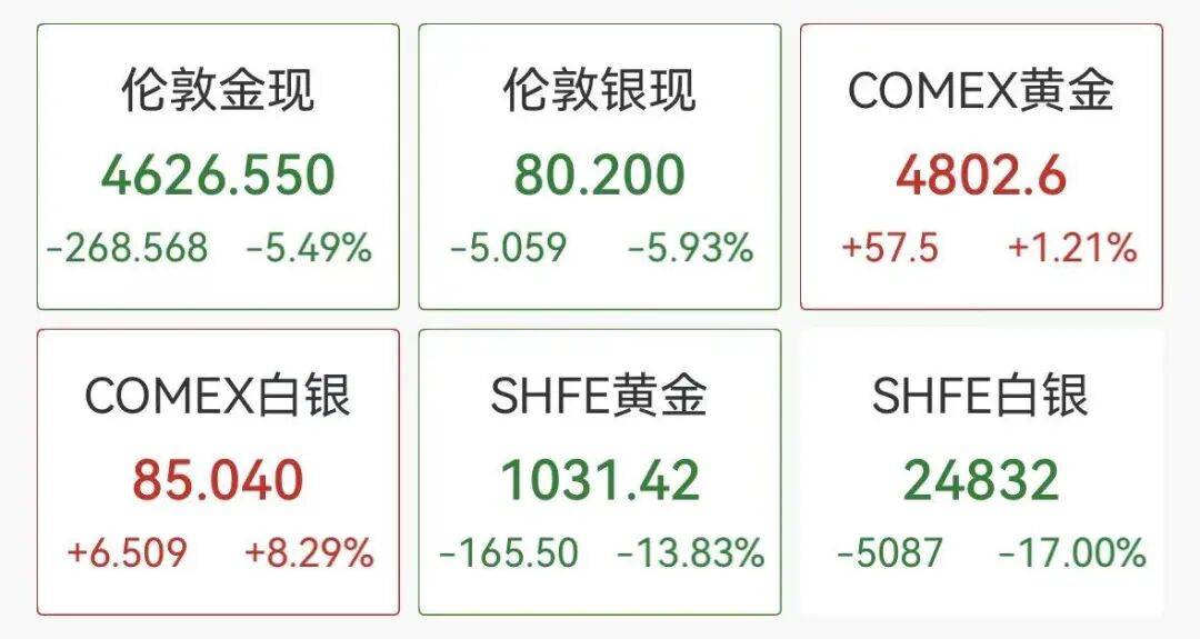 9:12左右,黄金、白银再次出现大跳水,现货黄金失守4590美元关口,一度跌至4583美元,现货白银也一度失守80美元关口,COMEX黄金涨超1%,报4802美元/盎司,COMEX白银期货涨超8%,报85美元/盎司。