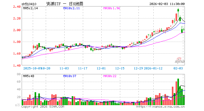 2月3日,截止午间收盘,资源ETF(510410)涨2.56%,报2.001元,成交额5063.80万元。资源ETF(510410)重仓股方面,紫金矿业截止午盘涨2.76%,中国铝业涨1.10%,洛阳钼业涨1.77%,华友钴业涨0.12%,中国石油跌2.62%,中国石化跌1.72%,中国神华跌1.17%,北方稀土涨3.32%,陕西煤业跌0.76%,中国海油跌0.39%。