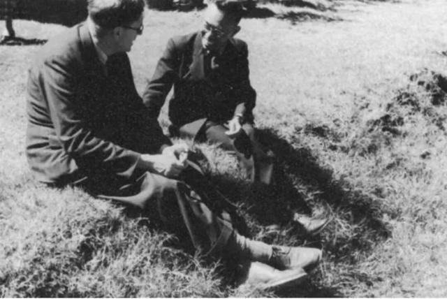 1944年8月,世界著名学者李约瑟(左)在考察昆明时与汤飞凡交谈。