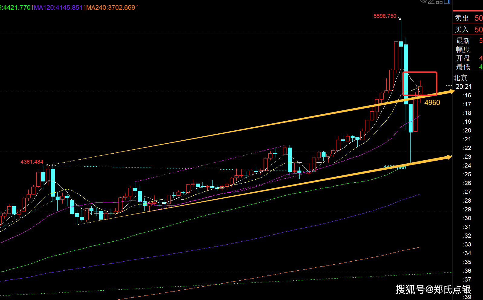 第一,黄金日线级别:从日线图看,黄色上行通道的上轨承压点今日有所突破,看4960回踩能否稳定住;另外,重点是看10均线的收盘得失,价格今日对应上移至5040左右,若收盘于10日上方,那么通道基本是有效上破,就存在周视频提及的20%小概率,直接一个V持续拉升,去打一个次高点5400左右,对应人民币大概1220元左右;那么底部没经过横盘时间,短时间内直接V拉升的话,后市的稳定性可能不高,就容易以大收敛三角来演变,走更大的宽幅整理范围,所以真发生这种直接V的情况,5400及上方就要及时做好减持保护;本周一恐慌性抛售延续时,外盘4540直接击穿是不敢尝试炒底,但积存金或实物完全可以加子弹,那天通知对应的是1022左右,到今天已经有100多块的拉升利润; 当然,若日线10日收盘站不稳,冲高回落了,就可能维持10日和中轨之间震荡运行看,相对底部整理过几天再上攻,才能有相对好的延续力度,刷历史新高;