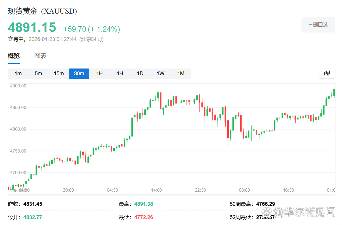 现货黄金涨超1.2%,刷新历史高位至4891美元上方,得益于美元走弱。