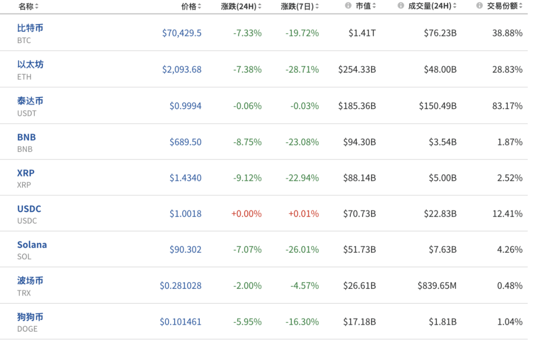 其他加密货币跟随跌势,BNB、XRP、狗狗币跌幅居前。