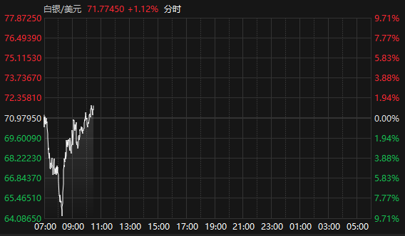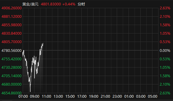 上证报中国证券网讯 据Choice数据,2月6日,国际现货黄金站上4800美元/盎司关口,截至10:28报4801.83美元/盎司,日内涨0.44%;现货白银报71.77美元/盎司,日内涨1.12%。