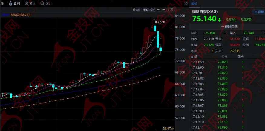 不过,今日早盘现货白银跳水,跌幅最大超5%,截至目前,现货白银在75美元附近徘徊。