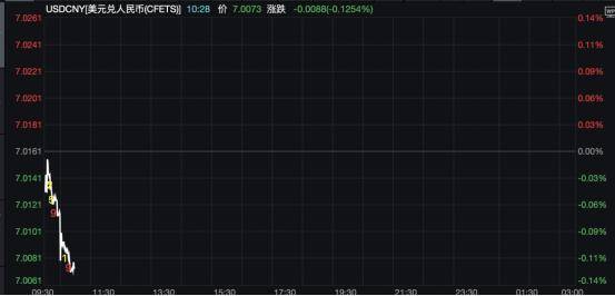 在岸人民币方面,Wind数据显示,截至25日10:28,该市场汇率报7.0073元,较前收盘价上涨88个基点,盘中最高报7.0061元。