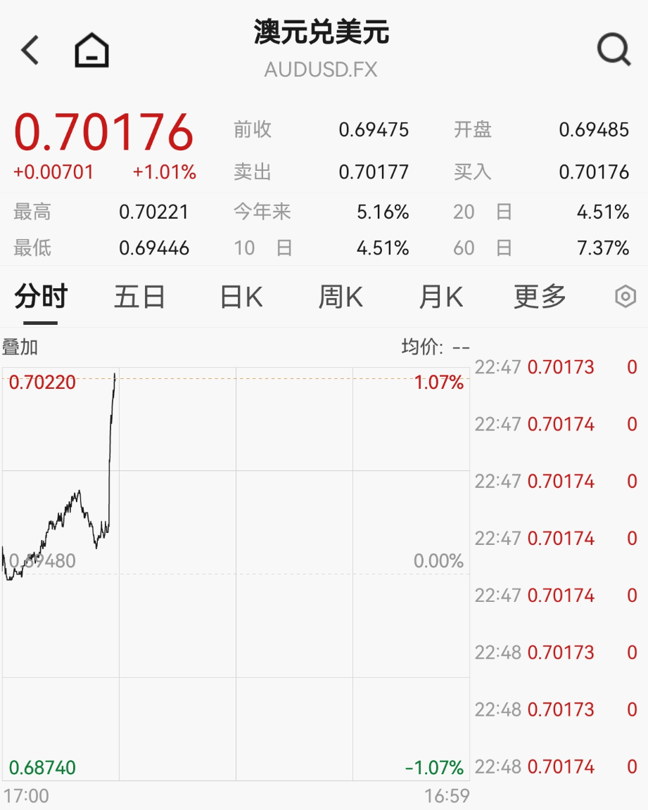消息公布后,澳元直线冲高,涨超1%。