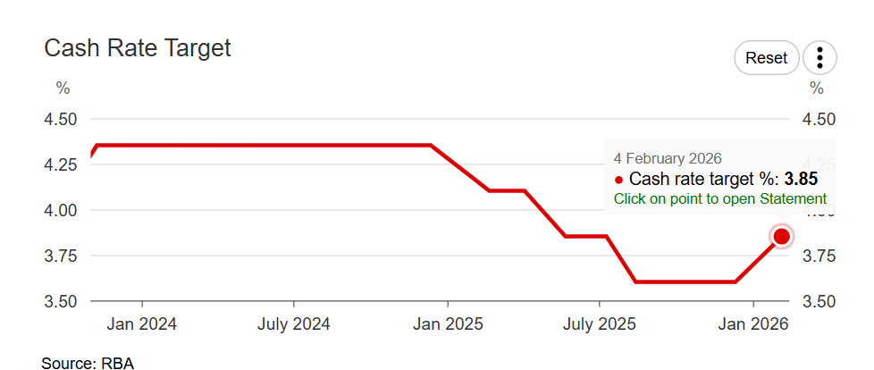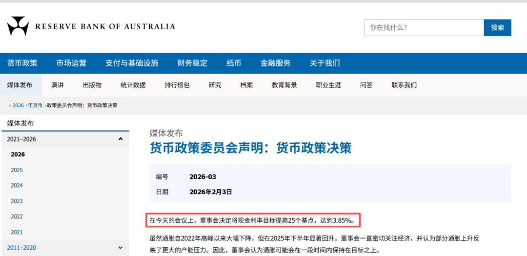 2月3日,澳洲联储(RBA)官网显示,其现金利率上调25个基点至3.85%。