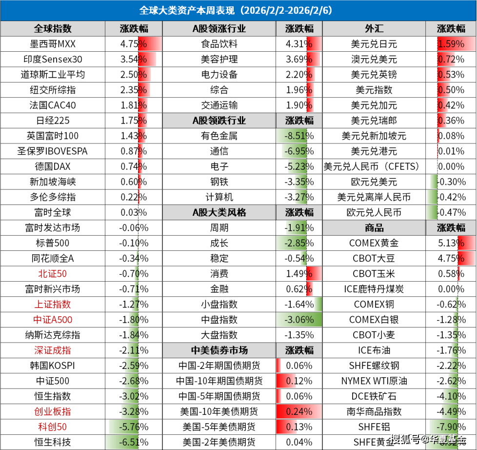 海外方面,本周美国三大股指表现不一。道琼斯指数上涨至历史新高,受周期股和防御性板块的支撑,而标普500指数和纳斯达克综合指数收跌,因科技股面临盈利预期修正和资本开支压力,尤其是软件和云计算公司受AI替代担忧影响,股价持续承压。美国劳动力市场数据显示疲软,裁员和失业金人数上升,市场对经济衰退预期增强,美债收益率大幅下行,随后又因为股市反弹收回部分跌幅。欧洲方面,主要市场走高,英国富时100、法国CAC40、德国DAX30收涨,呈现“震荡调整后反弹”格局,欧洲央行与英国央行2月5日同步维持利率不变。日本方面,日本众议院选举(2月8日)预期成为市场核心主线,市场押注执政党胜选并延续扩张性财政政策,叠加日元兑美元贬值大幅利好出口企业,成为日股上涨核心催化剂。
