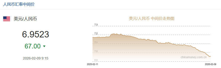 中新网2月9日电 据中国外汇交易中心网站消息,中国人民银行授权中国外汇交易中心公布,2026年2月9日银行间外汇市场人民币汇率中间价为:1美元对人民币6.9523元,上调67个基点。