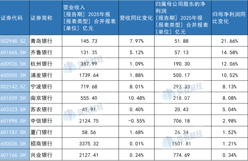 已披露业绩的11家上市银行中,除中信银行外,均实现2025年营收、净利润双增长,青岛银行、齐鲁银行、杭州银行净利润涨幅领先。
