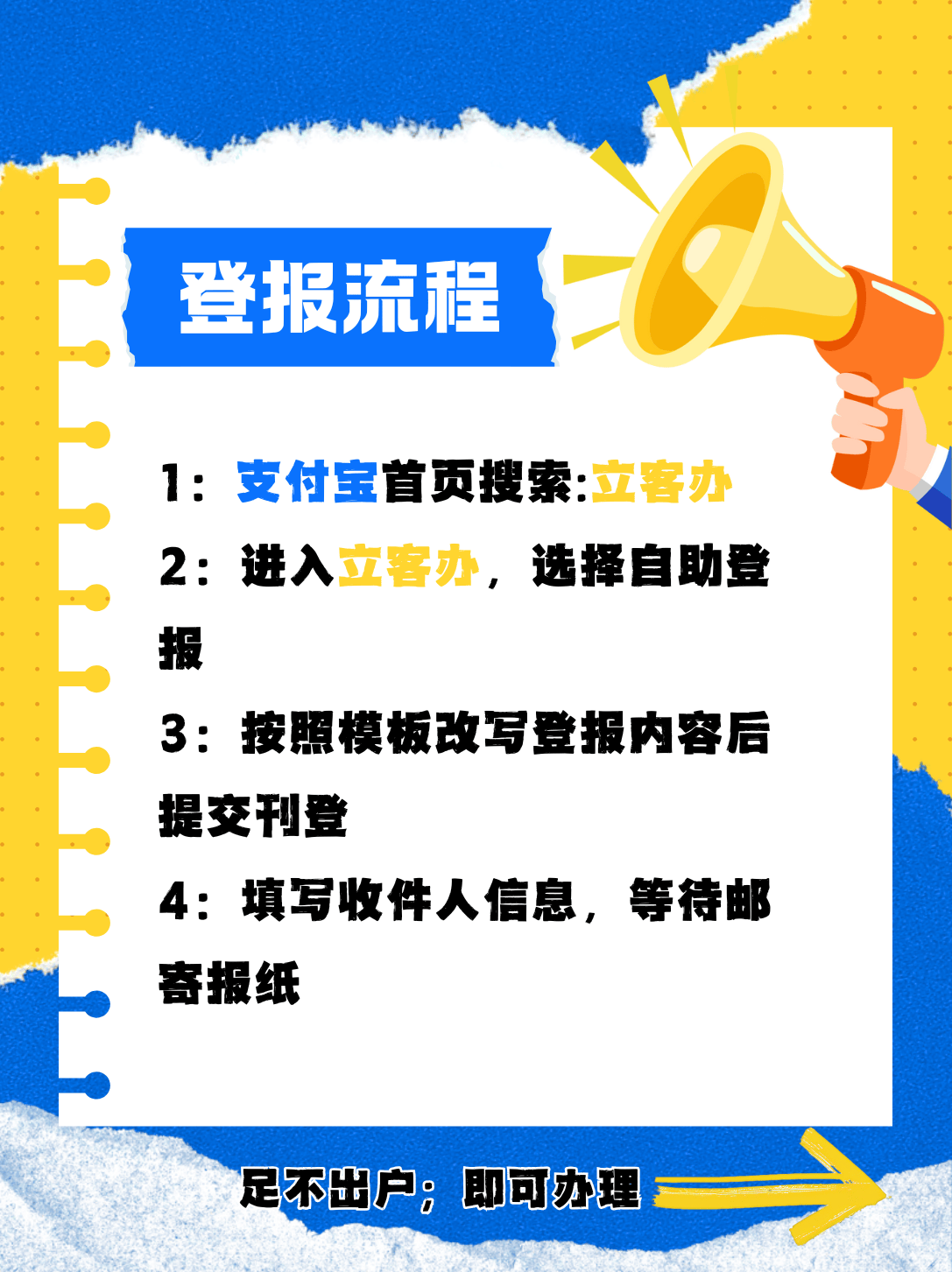 比如,在某付宝的“立客办”小程序上办理,填写信息、上传材料并支付费用后,第二天便可以见报并邮寄报纸。