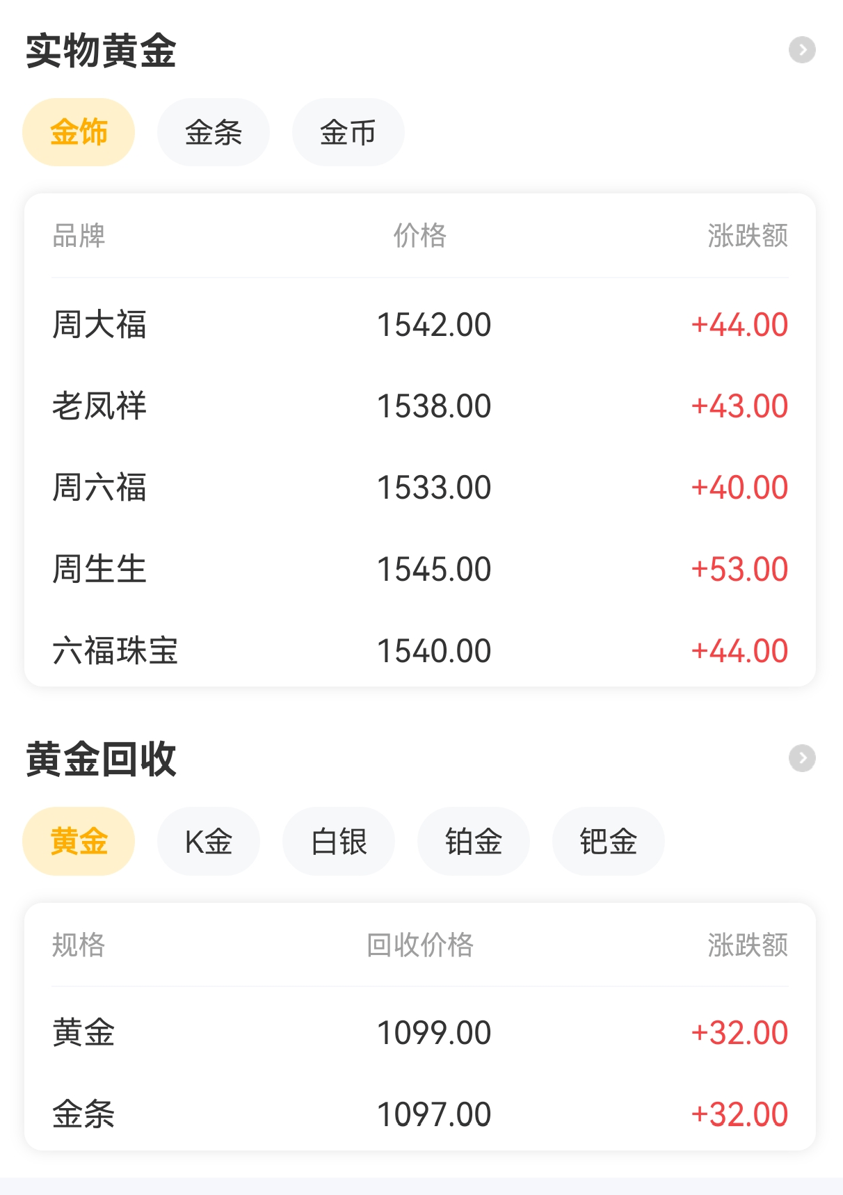 多家品牌金店一夜之间价格大涨,突破1500元/克关口。1月23日,老庙黄金报价1548元/克,单日上涨52元/克;周生生报价1545元/克,单日上涨53元/克。