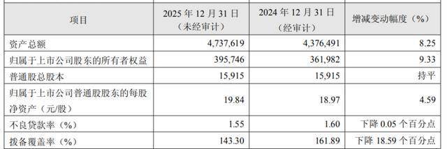 截至2025年底,该行资产总额47376.19亿元,比上年末增长8.25%,贷款总额25666.66亿元,比上年末增长8.47%。负债总额43378.19亿元,比上年末增长8.15%,存款总额23816.99亿元,比上年末增长10.71%。