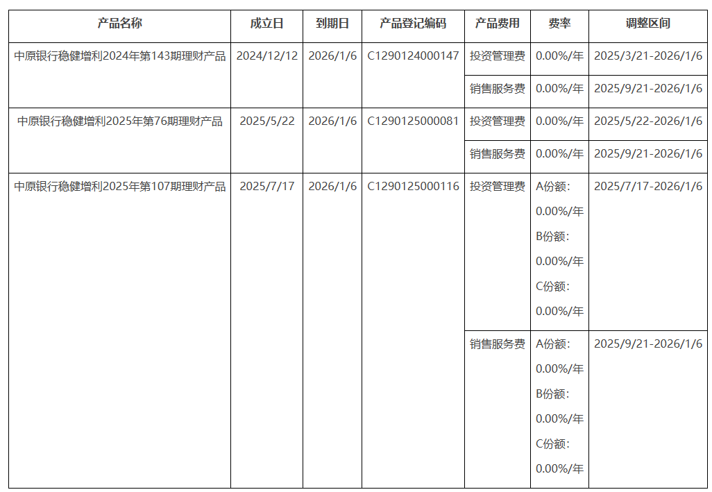 今年1月4日,中原银行“关于调整稳健增利系列部分产品费率的公告”,将部分产品投资管理费、销售服务费费率均调降至0.00%/年。不过相关产品费率调整于1月6日到期。