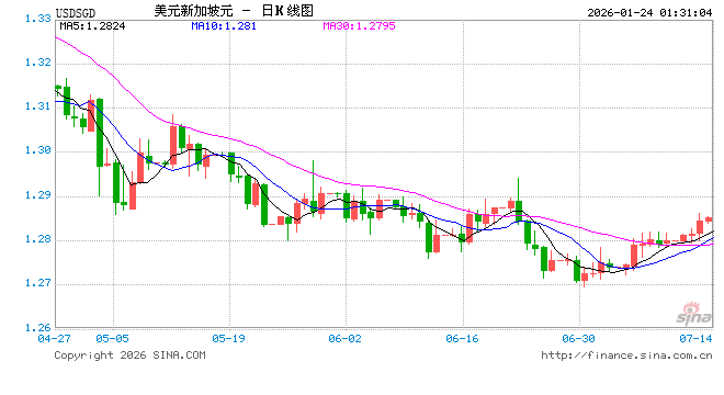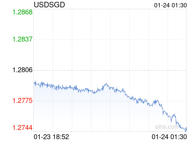 新浪外汇消息2026年01月24日,截至01时30分,外汇市场上美元兑新加坡元汇率跌破1美元兑换1.2739新加坡元。跌幅为-0.5232%
