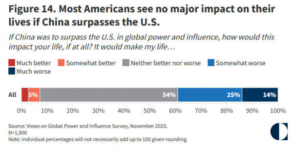 报告还注意到,虽然大多数受访者都很看重美国的海外实力和影响力,但多数美国人并不认为中国赶超美国将给他们带来“灾难性后果”。
