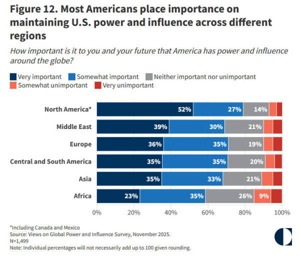 尽管美国民众普遍支持美国政府维持在海外的全球影响力,但多数受访者更重视美国在北美地区的影响力。对于亚洲地区,主张美国维持力量和影响力“非常重要”或“比较重要”的受访者分别为35%和33%,合计68%,在所有地区中排在第五位。